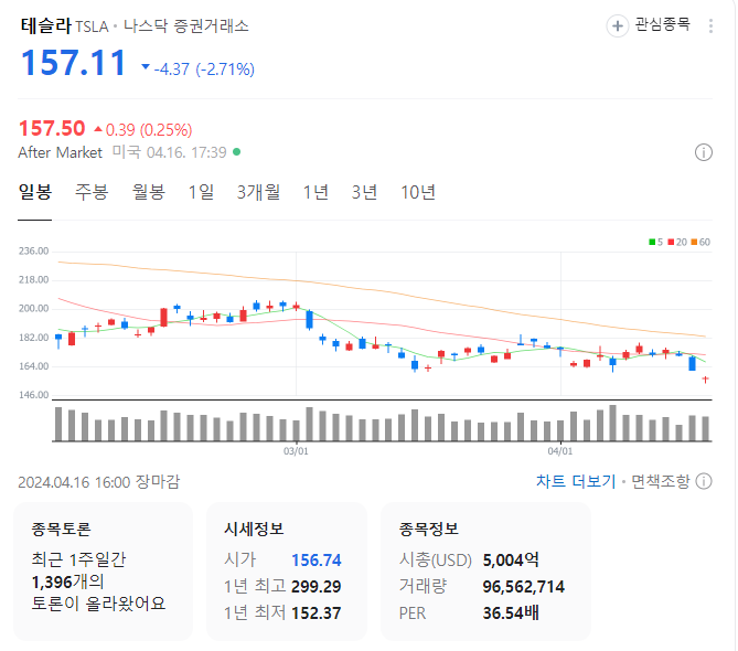 테슬라의 감원 결정과 모델2 개발 중단의 소식에 대한 주식 시장의 반응은 부정적입니다.