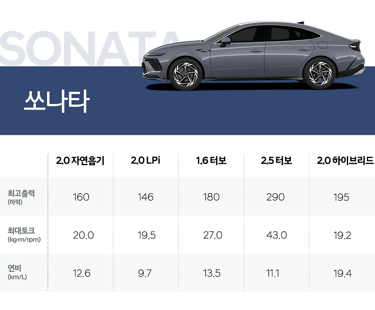 쏘나타는 5가지 파워트레인을 제공하며, 2.0 자연흡기, 1.6 터보, 2.5 터보 등이 있습니다. 1.6 터보 모델은 높은 출력과 연비로 인기가 많으며, 2.5 터보는 290마력의 강력한 성능을 자랑합니다. 이 외에도 하이브리드 모델이 있어 연비와 성능의 조화를 이루고자 하는 소비자에게 좋은 선택이 됩니다.