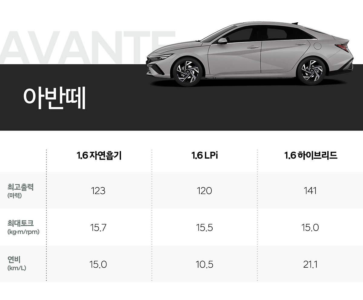 아반떼는 1.6리터 자연흡기 엔진을 기반으로 가솔린, LPG, 하이브리드 모델을 제공합니다. 1.6 가솔린 모델은 합리적인 가격과 높은 연비로 인기가 많으며, 주행거리가 긴 소비자에게는 1.6 하이브리드 모델도 매력적입니다. 하이브리드 모델은 고속도로 연비가 20.7km/L에 이르며, LPG 모델은 연료비 절감 효과가 큽니다.