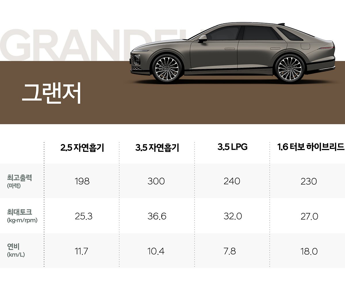 그랜저는 1.6 터보 하이브리드, 2.5 자연흡기, 3.5 자연흡기 등의 옵션을 제공합니다. 1.6 터보 하이브리드는 연비와 출력을 동시에 만족시키며, 2.5와 3.5 자연흡기 모델은 각각 부드러운 주행과 고배기량 특유의 풍부한 토크를 선호하는 소비자에게 적합합니다.