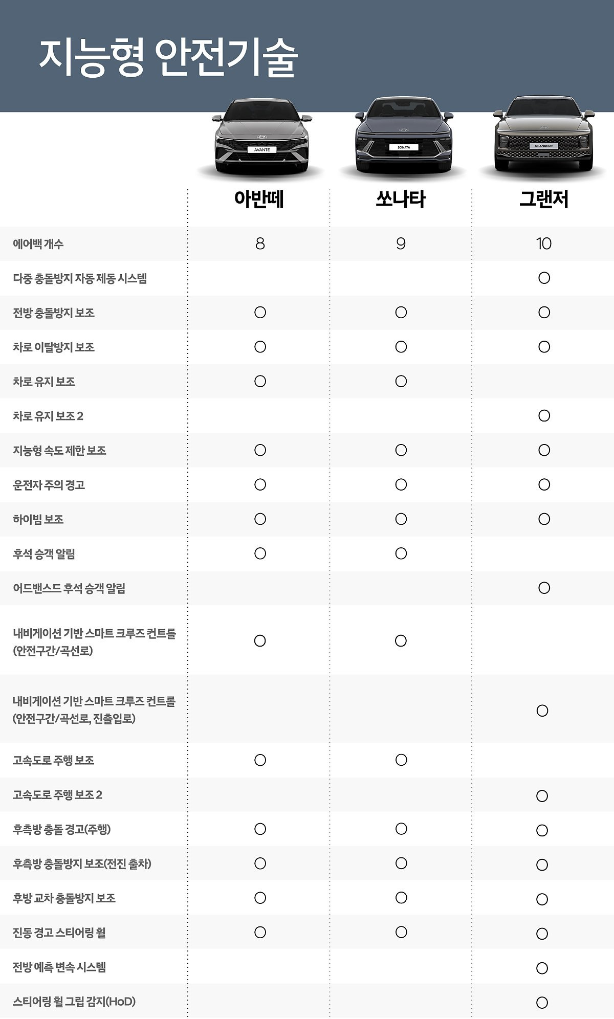 현대차 세단 3종은 각기 다양한 안전 및 편의 장비를 탑재하고 있습니다. 특히 그랜저는 최신 시스템을 갖추고 있어 세 차종 중 가장 많은 안전 및 편의 장비를 제공합니다. 다중 충돌방지 자동 제동 시스템, 고속도로 주행 보조 2, 스티어링 휠 그립 감지 등이 그 대표적인 예입니다.
